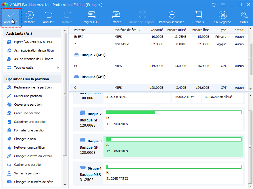 Conseil : si le système de fichiers sur votre ordinateur est FAT32, vous pouvez convertir FAT32 en NTFS. Par rapport à un système de fichiers FAT32, NTFS possède une meilleure performance qui permet à votre ordinateur de fonctionner mieux.
