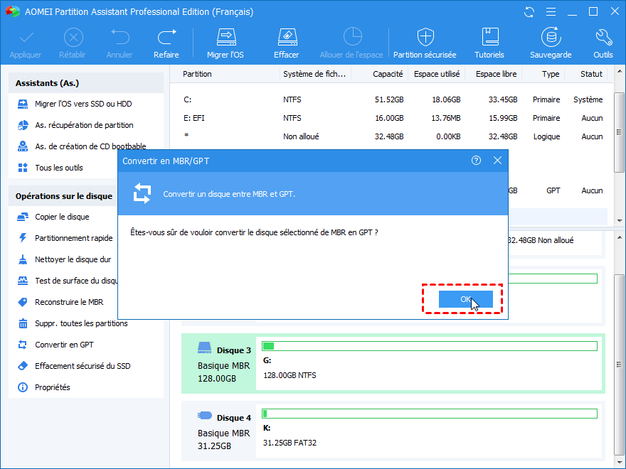 Étape 5. C'est la dernière étape de toute l'opération sur la conversion de MBR en GPT. Cliquez simplement sur OK lorsque vous recevez un message comme « Félicitations ! Toutes les opérations ont été effectuées avec succès ».