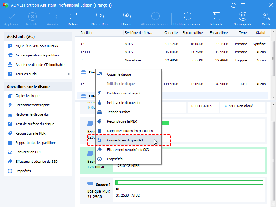 Étape 1. Téléchargez AOMEI Partition Assistant Professional, installez-le. Ensuite, ouvrez-le, vous pouvez voir la page principale, cliquez sur le disque que vous souhaitez convertir et sélectionnez Convertir en GPT.