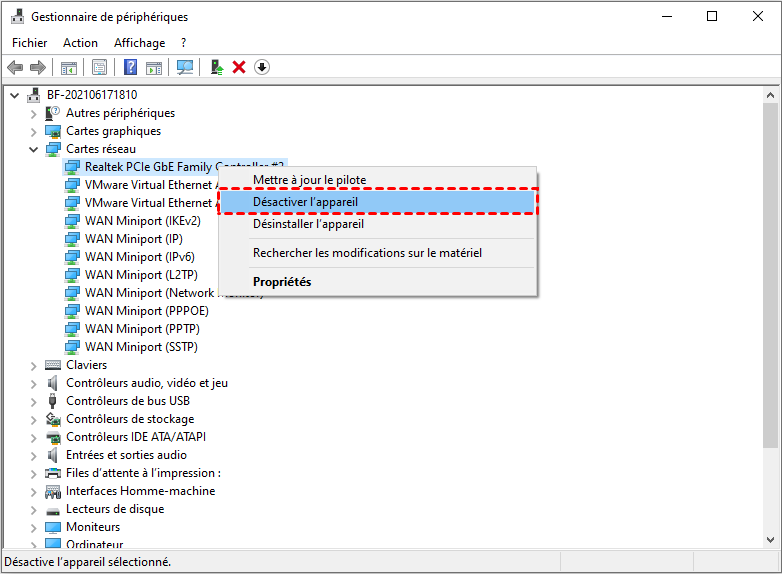 2. Cliquez avec le bouton droit sur la première carte réseau et sélectionnez Désactiver l'appareil.