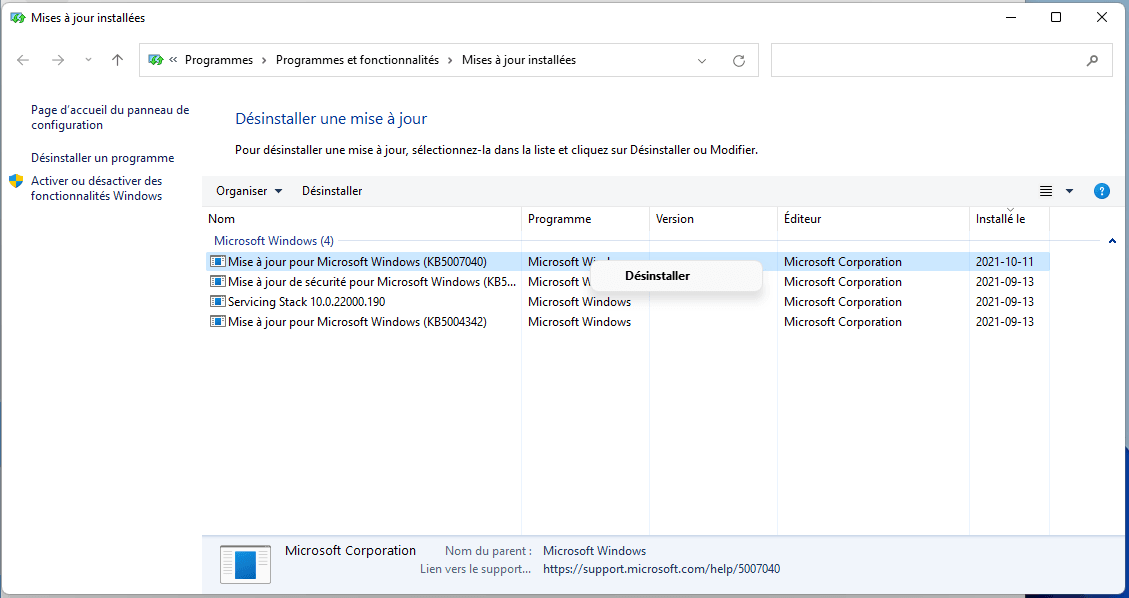 Étape 3 : Cliquez avec le bouton droit sur la mise à jour récemment installée dans la fenêtre contextuelle et sélectionnez Désinstaller. Confirmez la procédure.