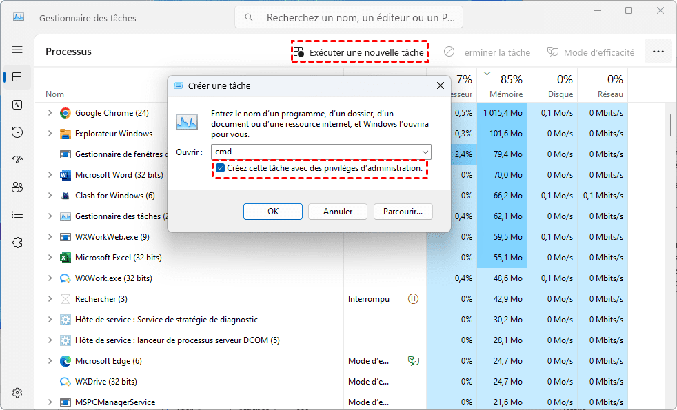 3. Tapez cmd, cochez Créer cette tâche avec des privilèges d'administration, puis validez.