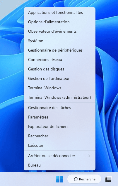 Utilisation du menu Démarrage : Dans la barre des tâches, cliquez avec le bouton droit sur le bouton Démarrage et choisissez Gestionnaire des tâches dans le menu étendu.