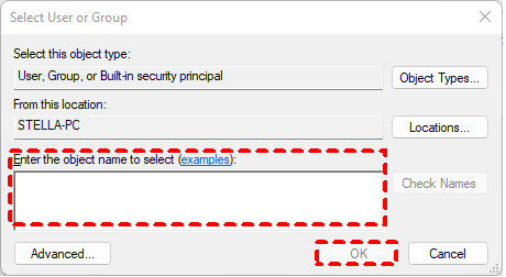 Étape 5. Entrez votre nom d'utilisateur dans « Entrez le nom de l'objet à sélectionner » et cliquez sur le bouton « Vérifier les noms ». Si tout est ok, cliquez sur « OK » pour enregistrer les modifications.