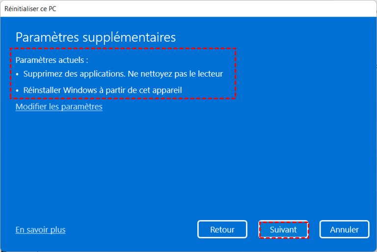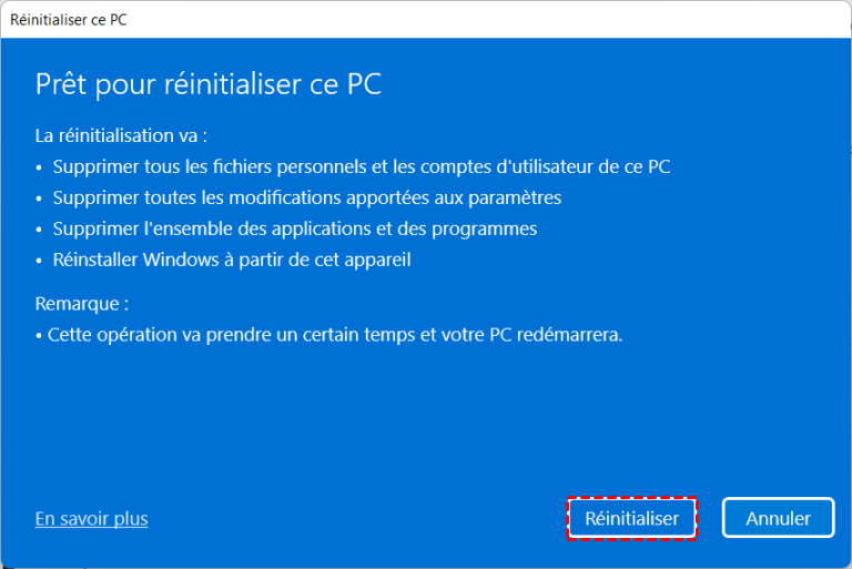 Étape 8. Enfin, vous verrez quelques actions à effectuer dans la fenêtre de la dernière étape, si vous êtes sûr de vouloir réinstaller Windows 11, cliquez sur le bouton « Réinitialiser ».