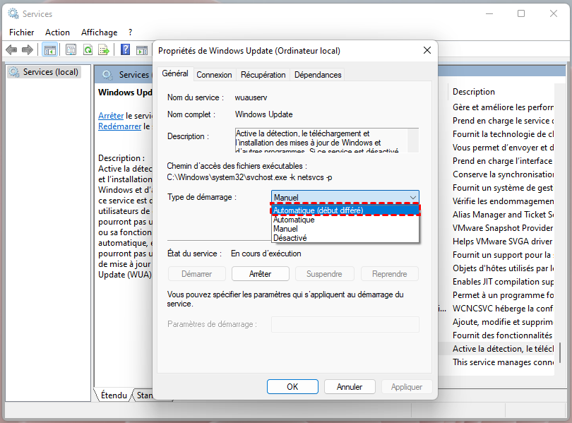Étape 1. Ouvrez la fenêtre Services comme celle ci-dessus. Choisissez « Windows Update » dans la liste et double-cliquez dessus pour ouvrir ses propriétés.