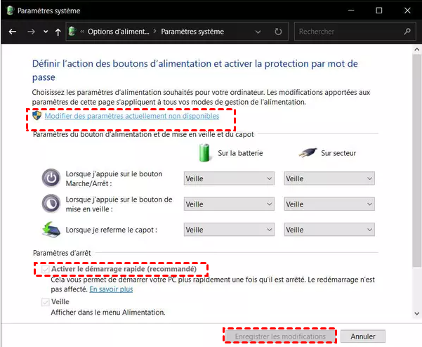Étape 5. Décochez l'option « Activer le démarrage rapide (recommandé) » et cliquez sur « Enregistrer les modifications ».
