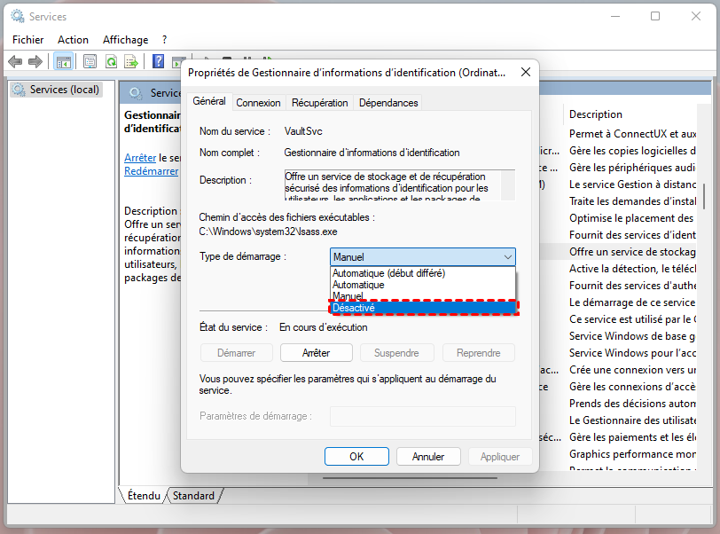 Option1. Désactiver le service du Gestionnaire d'informations d'identification