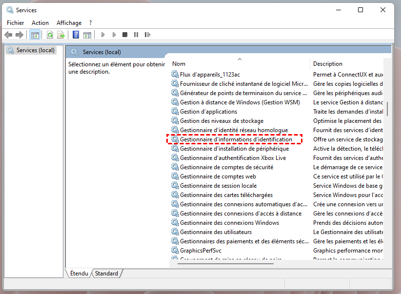 Étape 2. Dans la fenêtre « Services », recherchez « Gestionnaire d'informations d'identification » dans la liste et double-cliquez dessus pour ouvrir ses propriétés.