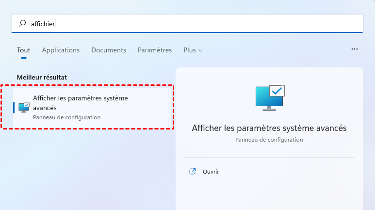 Étape 1. Recherchez Afficher les paramètres système avancés dans la barre de recherche et ouvrez-le.