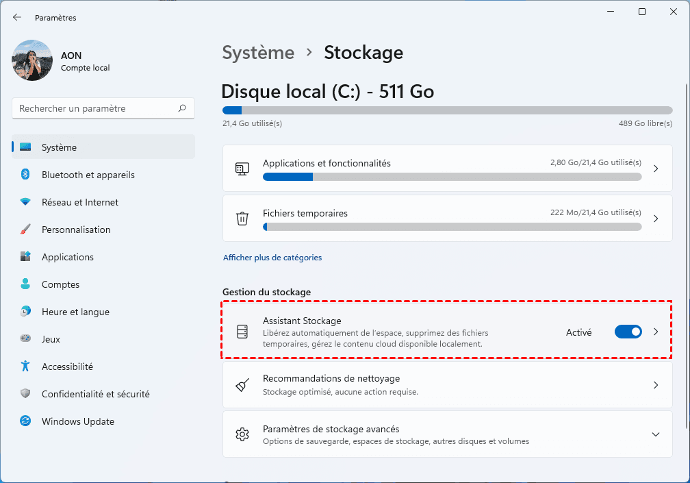 Stockage Assistant est une fonctionnalité puissante de Windows 11 qui peut libérer efficacement de l'espace sur le disque dur. Afin de profiter de meilleures performances, vous pouvez nettoyer les données inutiles en suivant les étapes suivantes :