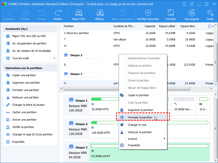 Si le système de fichiers de votre carte SD est corrompu ou non reconnu, il ne s'affichera pas correctement dans l'Explorateur de fichiers, même après que la lettre de lecteur lui a été attribuée, et vous serez impossible d'ouvrir la carte SD. Dans ce cas, vous pouvez choisir de la formater avec un système de fichiers compatible avec Windows. Il est recommandé d’utiliser AOMEI Partition Assistant Standard. Il peut s’appliquer dans les systèmes d’exploitation Windows 11/10/8/7 et vous permet de formater la carte SD , la clé USB et le disque dur au format exFAT, FAT32, NTFS, Ext2, Ext3 et Ext4. Regardez les étapes détaillées :
