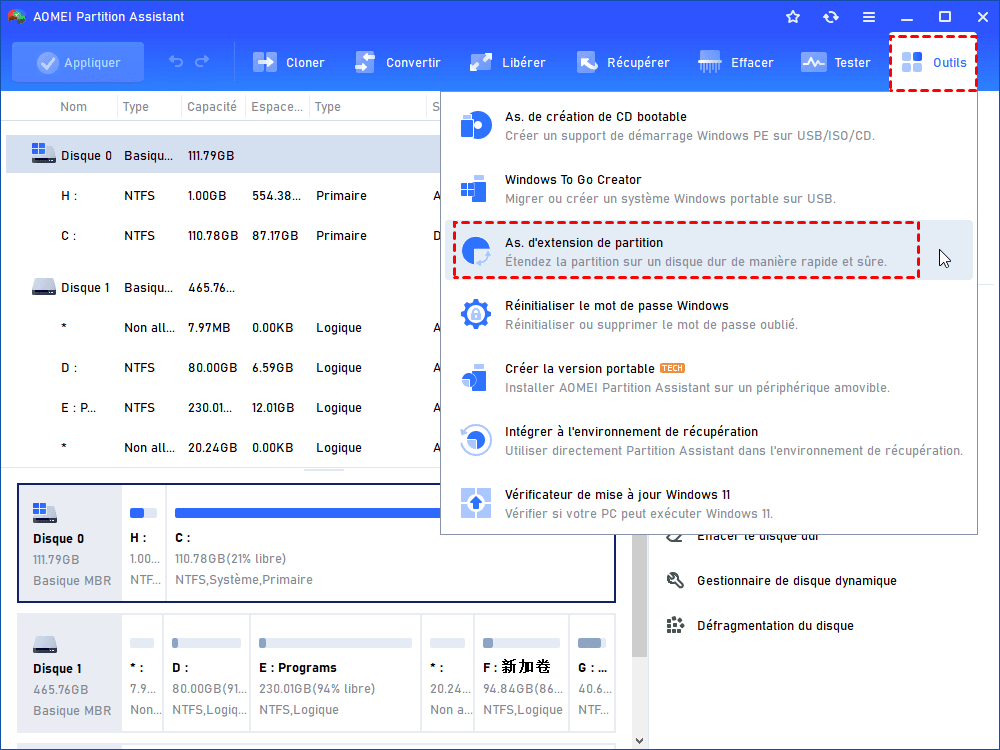 Après avoir converti votre disque en GPT, vous pouvez maintenant étendre votre partition à plus de 2 To. Vous pouvez toujours utiliser AOMEI Partition Assistant. La différence consiste à utiliser une autre fonction - « As. d’extension de partition » dans Outils.