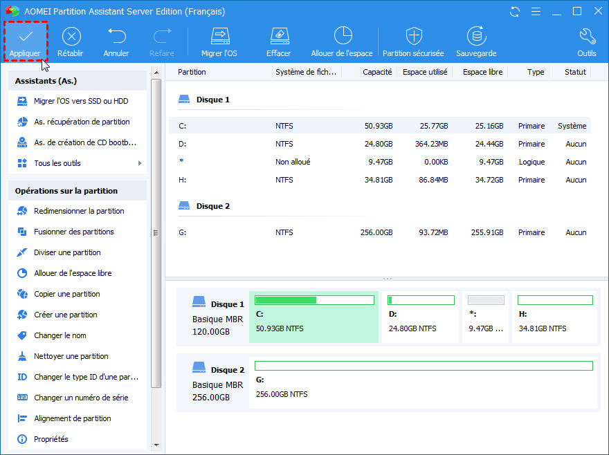 Grâce à son interface conviviale, vous pouvez gérer vos partitions, disques sans effort. Vous pouvez d'abord télécharger sa version gratuite pour un essai.