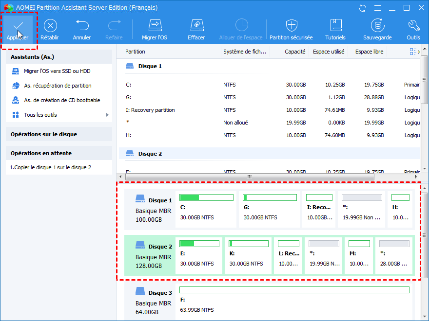 Étape 4. Vous constaterez que toutes les partitions du disque source ont maintenant une duplication intacte sur le disque de destination. Ceci est un résultat virtuel, vous devez cliquer sur Appliquer > Exécuter pour mettre en miroir le disque dur sur Windows Server 2008.