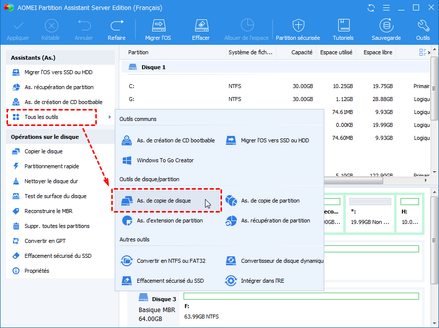 L'autre méthode de clonage dans AOMEI Partition Assistant est assez simple et permet de gagner du temps. « Cloner rapidement le disque » clonera uniquement la partie utilisée du disque source sur le disque de destination, ce qui permet de cloner un grand disque sur un disque plus petit sur Server. Au cours des étapes de la copie, vous avez le choix entre trois options pour ajuster la taille de la partition : Cloner sans redimensionner, Adapter la totalité du disque, Éditer les partitions.