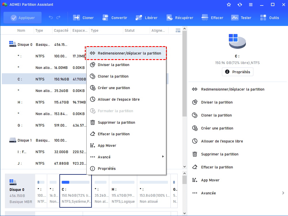Étape 3. Maintenant, faites un clic droit sur le disque C et sélectionnez Redimensionner/déplacer la partition.