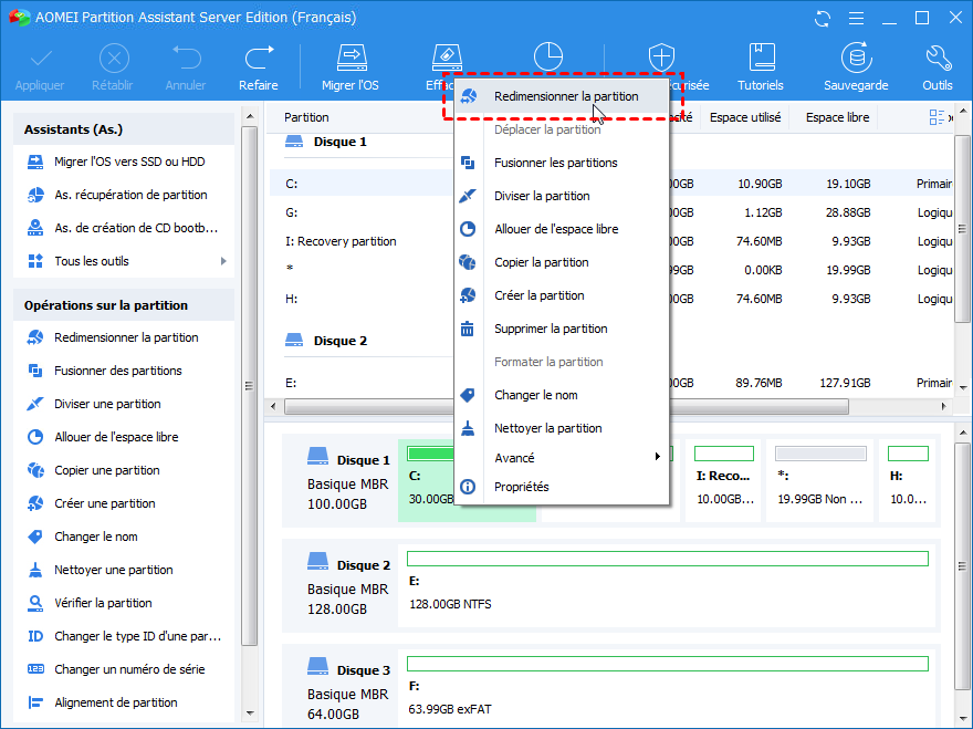 Redimensionner le lecteur C via AOMEI Partition Assistant Server