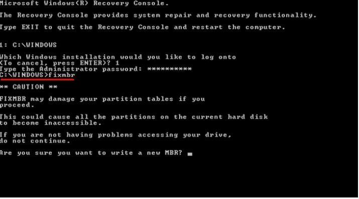 4. À l'invite de commande, tapez fixmbr et appuyez sur Entrée. Confirmez ce que vous allez faire en tapant O et appuyez sur Entrée.