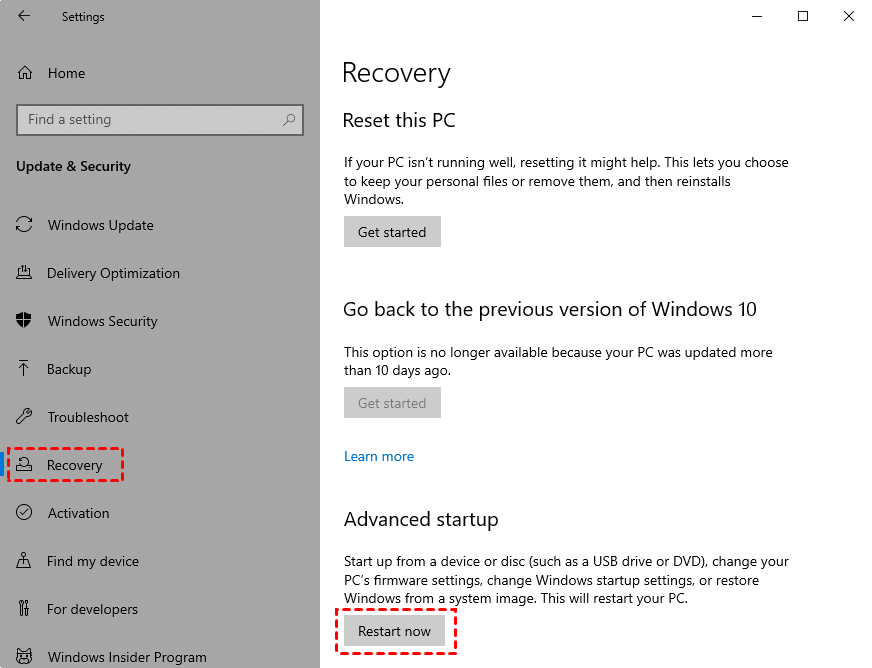 Step 2. On the left column, choose "Recovery". Under Advanced startup tab, select "Restart now".