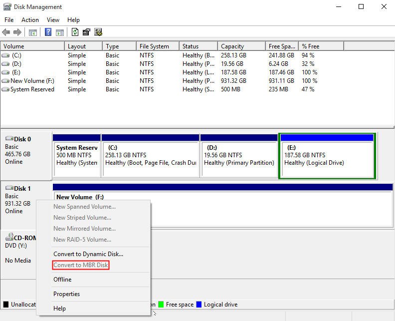 "Convert to MBR Disk" greyed out in Disk Management