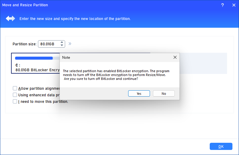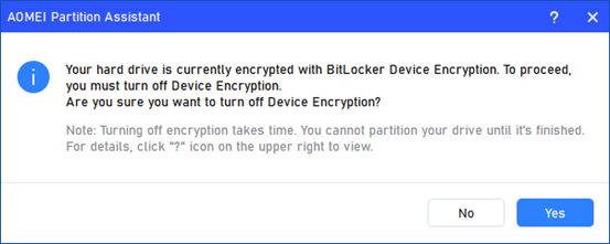 When you click "Yes", the program will automatically turn off BitLocker encryption for this partition. However, you need to enter the key to decrypt BitLocker before you turn it off.