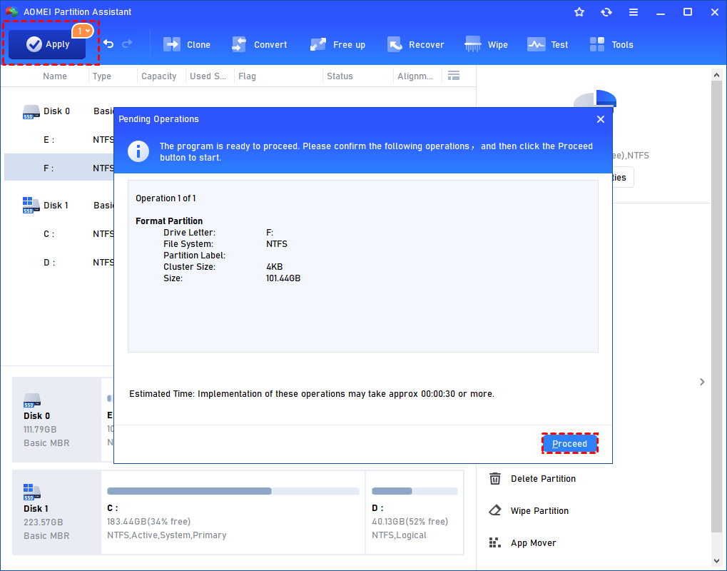 You can see the changes in the main window. To commit it, please click "Apply" --> "Proceed" and the format partition operation will start.