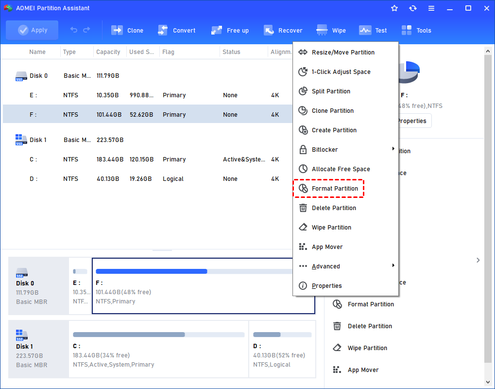 Launch Partition Assistant in the main console, right-click the partition you want to format (Let's take F: partition for an example), and then select "Format Partition".