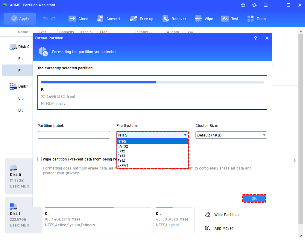 In the pop-up window, you could reset the partition label, file system, and the cluster size (smaller cluster size makes less wasting of disk space, and we usually recommend you use the default size if you don’t know which one is better). Click "OK" to confirm the changes.