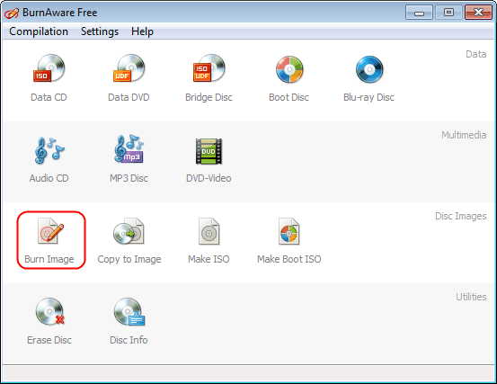 Step 1. Download BurnAware and install it. And then insert a recordable CD, DVD, or Blu‑ray Disc into your disc burner. Launch BurnAware and select "Burn Image" in the main window.