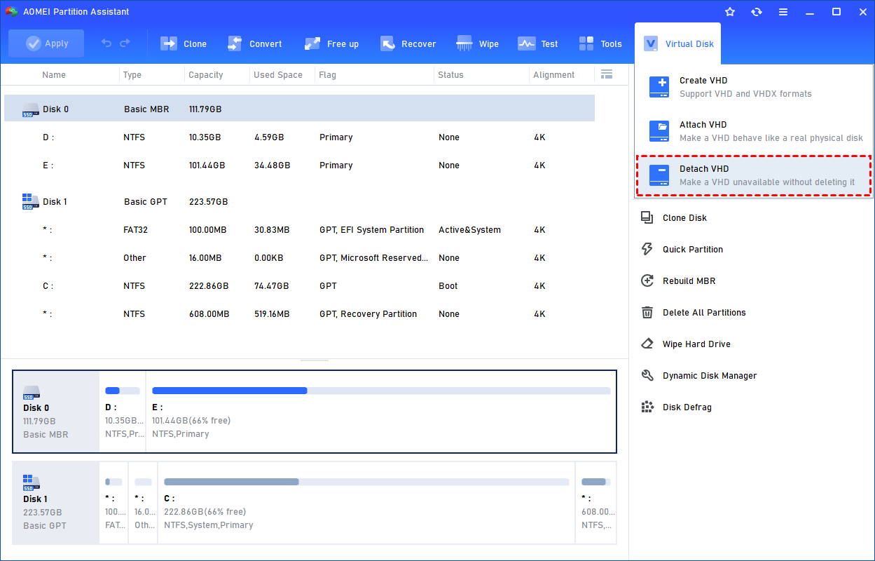 With the feature "Virtual Disk" in Partition Assistant, you can easily create, attach, and detach your virtual disks on your computer.