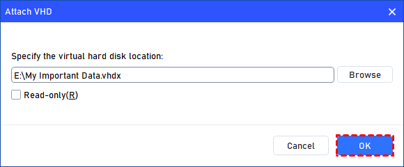 Once the virtual file is selected, you can click "OK" to start attaching the VHD.