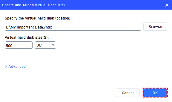 Once the virtual disk location and size are set up, you can click "OK" to start creating the VHD.