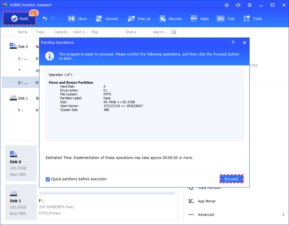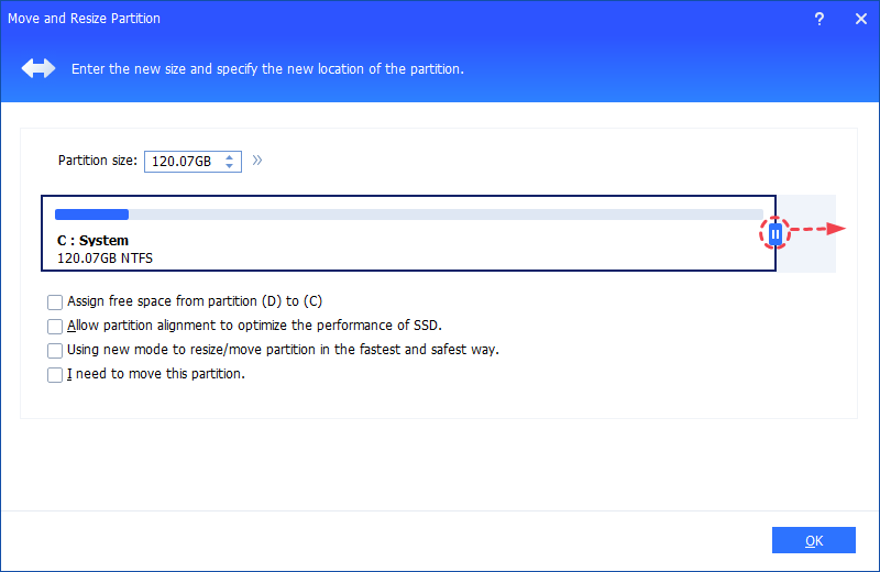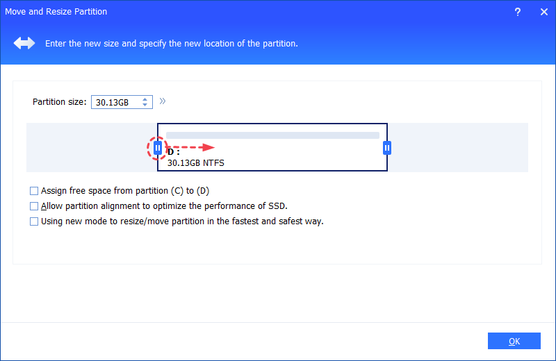 - There is an option "Using new mode to resize/move partition in the fastest and safest way.". If you tick this option, it will be safer and faster to resize your partitions, especially for NTFS partitions. Once this option is checked, the data will be intact even if the software ends abruptly or is cancelled during the operation.
