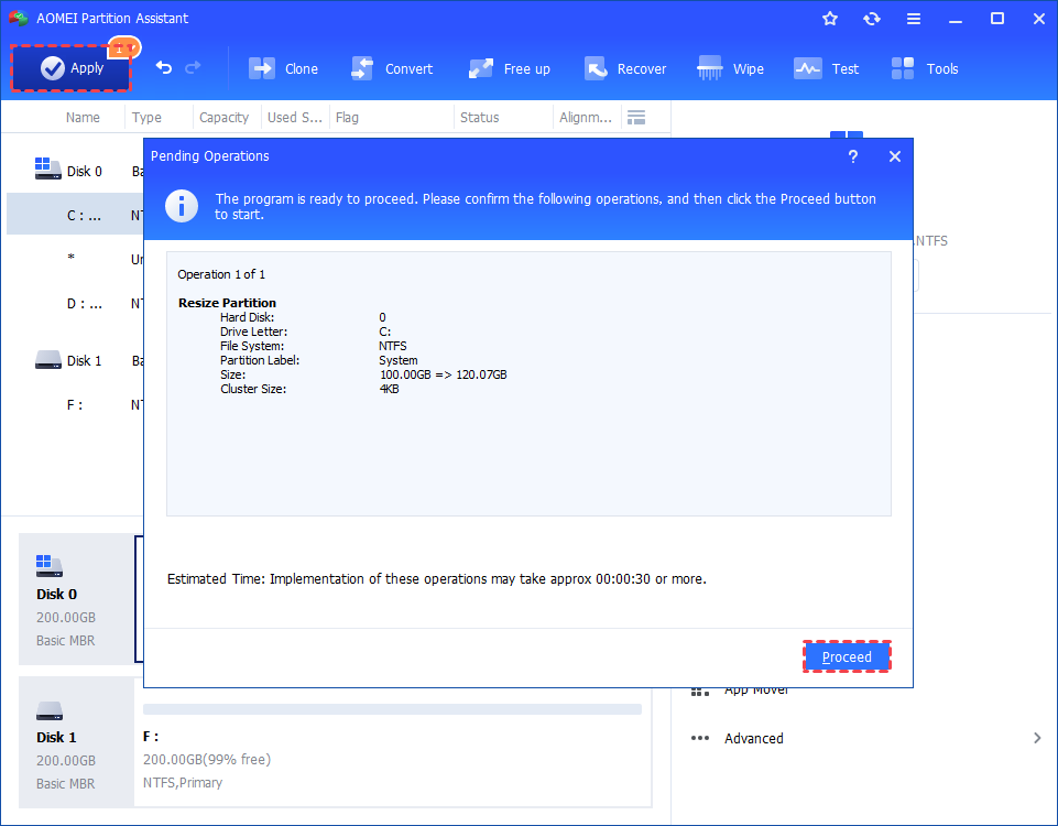 Wait for the operation to be finished. After it is completed successfully, you will find the C: partition has been expanded.