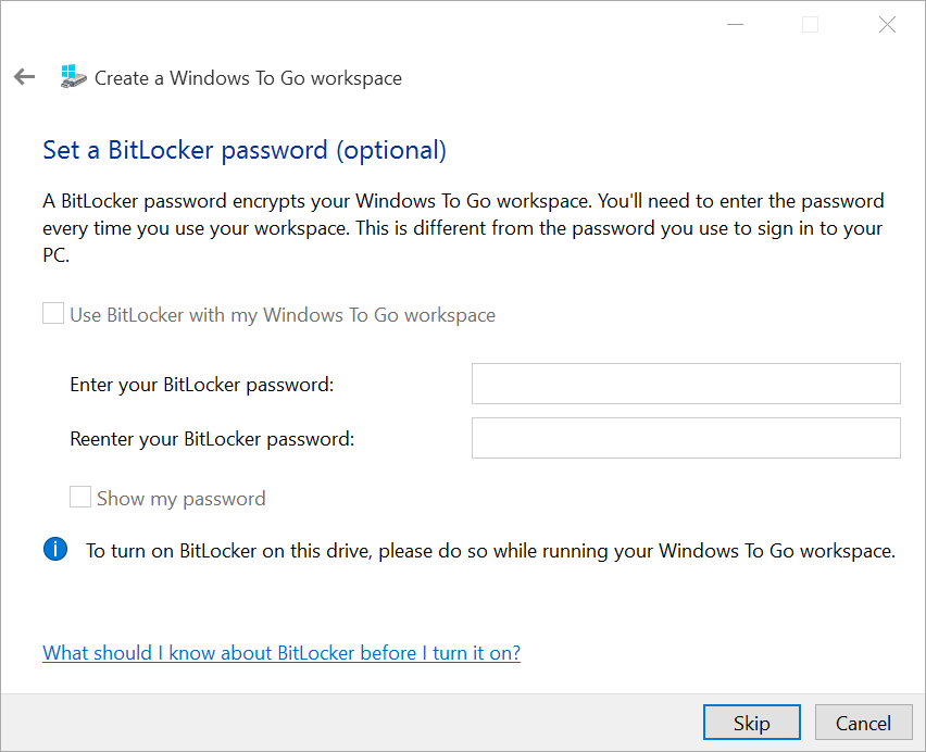 Langkah 6. Pilih apakah akan menggunakan BitLocker pada flash drive Windows 10 atau tidak. Jika Anda memilih untuk menggunakannya, Anda akan diarahkan untuk mengatur kata sandi untuk membuka drive di masa mendatang.