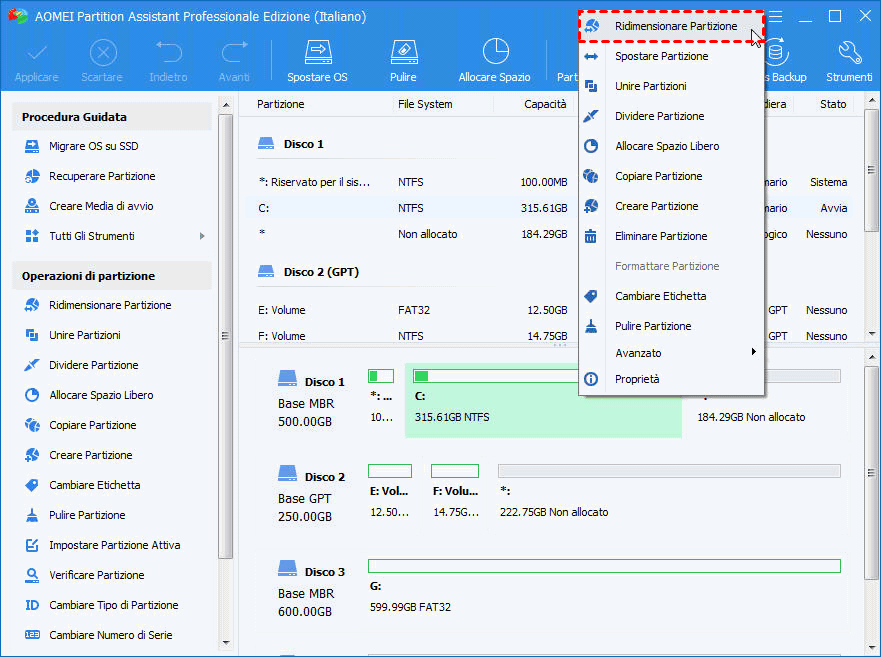 AOMEI Partition Assistant è un software professionale progettato per risolvere problemi di partizione e disco in Windows 7/8/10/XP. Con esso, è possibile aggiungere spazio non allocato alla partizione senza sforzo. Offre varie opzioni, tra cui Estendi partizione guidata, Ridimensionare partizione e Spostare partizione, Unire partizione.