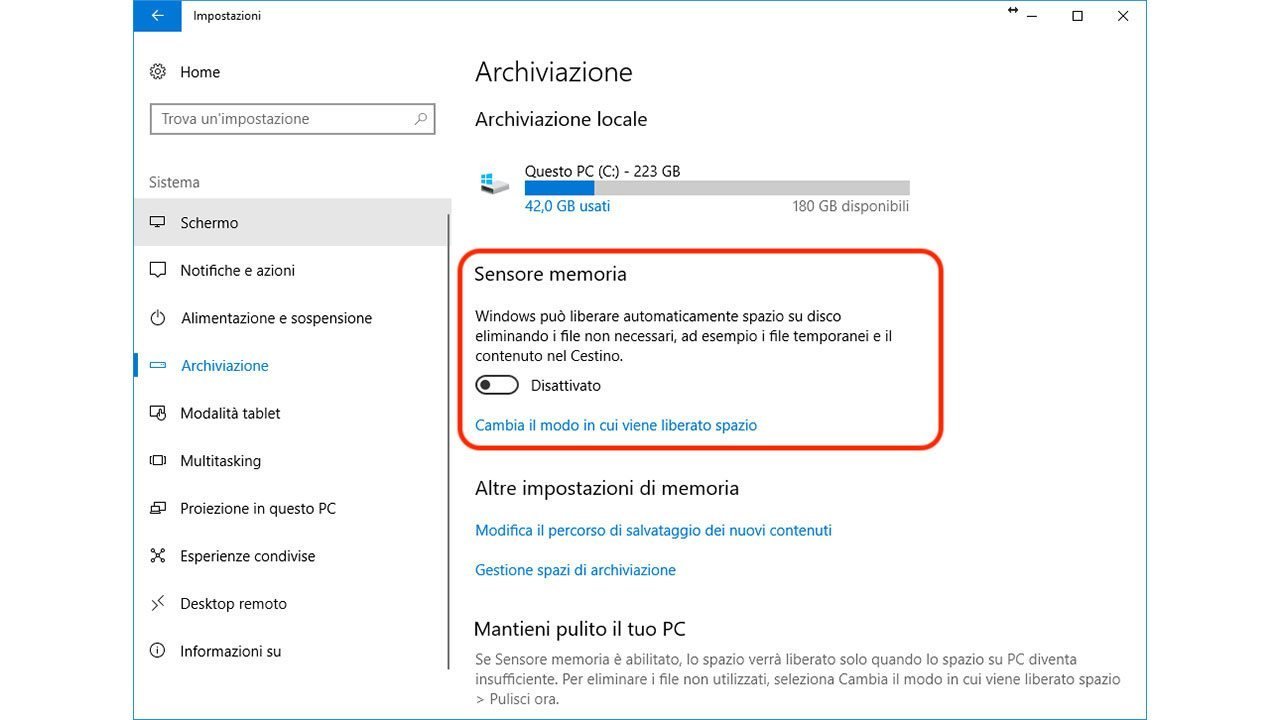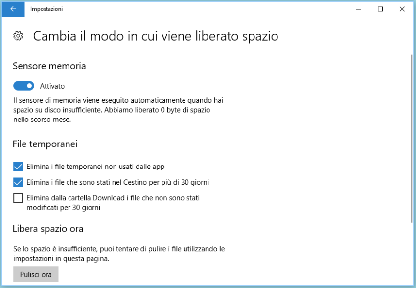Se “Sensore memoria” è stato disabilitato, ora puoi eseguire i seguenti passi per farlo funzionare di nuovo ed eliminare automaticamente i file temporanei.