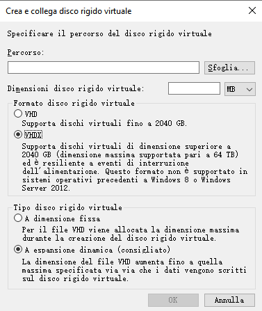 Formato del disco rigido virtuale: supporta sia VHD che VHDX.