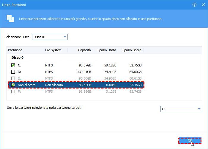 Passo 6. Nella schermata successiva, selezionare il disco C: e lo spazio non allocato, poi fare clic su "OK".