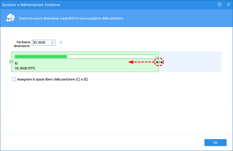 Passo 3. Nella finestra pop-up, trascinare l'estremità della partizione verso sinistra per ridurre questa partizione in modo da generare spazio non allocato.