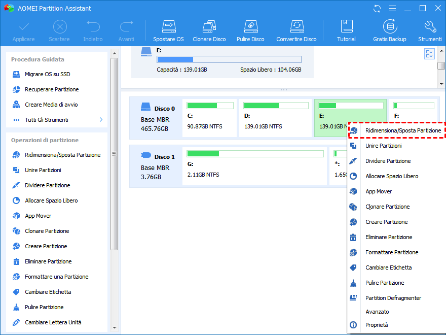 Passo 2. Fare clic con il pulsante destro del mouse su una partizione che ha più spazio libero e selezionare "Ridimensiona/Sposta Partizione". Se il hard disk dispone di spazio non allocato, è possibile saltare questo passo e passare al passo 5.