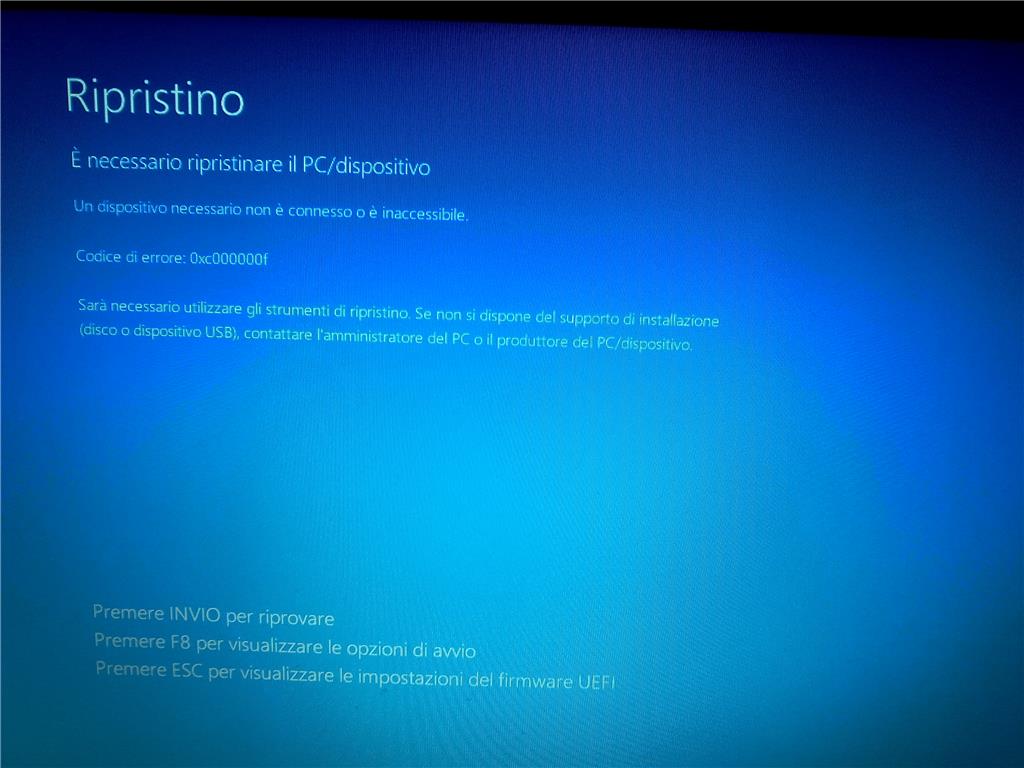 È necessario ripristinare il pc con codice di errore: 0xc000000f