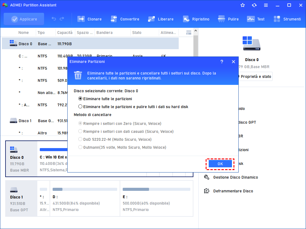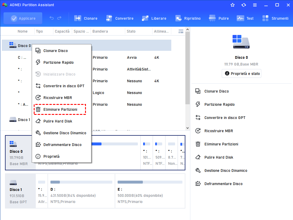 Passo 5. Verrà visualizzata nuovamente l'interfaccia di AOMEI Partition Assistant. Scegliere con il tasto destro l'unità di installazione e fare clic su "Elimina Partizioni"
