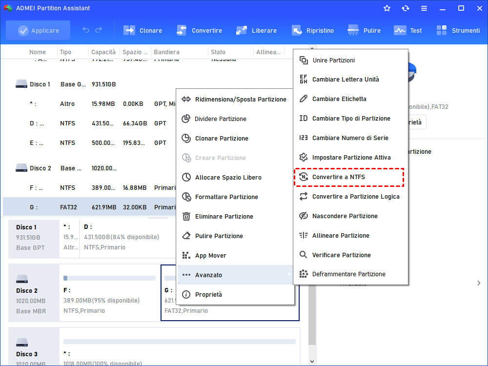 Passo 1. Installa ed avvia AOMEI Partition Assistant Standard. Fai clic con il tasto destro sulla partizione dell'hard disk esterno che desideri convertire e vai su "Avanzate" > "Convertire a NTFS".
