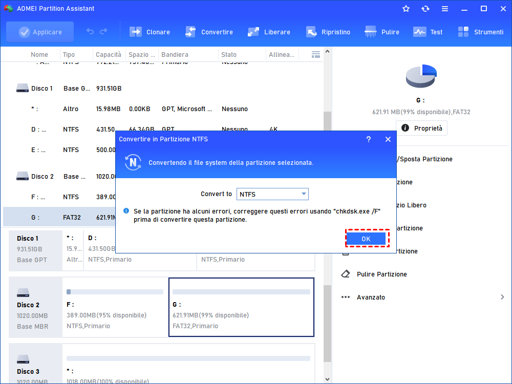 Passo 2. La partizione selezionata verrà convertita in NTFS. Fai clic sull'icona "OK".