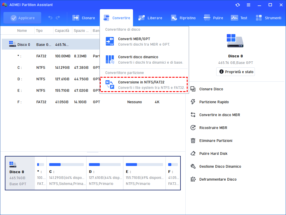 AOMEI Partition Assistant è un potente strumento di gestione delle partizioni. Puoi anche usufruire di altre funzioni più avanzate, come migrare il sistema operativo su SSD, allocare spazio libero, convertire il disco di avvio tra MBR e GPT senza rimuovere alcuna partizione, eliminare il disco di sistema e così via.