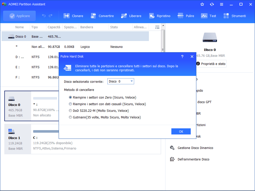 La semplice eliminazione o formattazione dei file sul hard disk può causare la perdita di informazioni, poiché tutti questi file possono essere recuperati da un software di recupero dati professionale. Per risolvere i problemi, devi usare un software speciale per pulire hard disk avviabile. AOMEI Partition Assistant è uno strumento speciale di partizione progettato per i sistemi operativi Windows (incluso Windows 11/10/8.1/8/7).