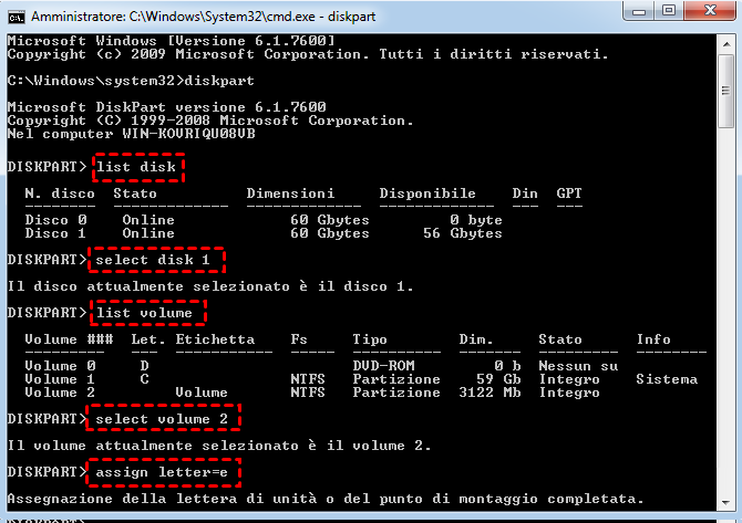 Aprire la finestra di comando di DiskPart: premere Win+R, inserire diskpart e premere Invio. Nella finestra, eseguire i comandi in ordine: