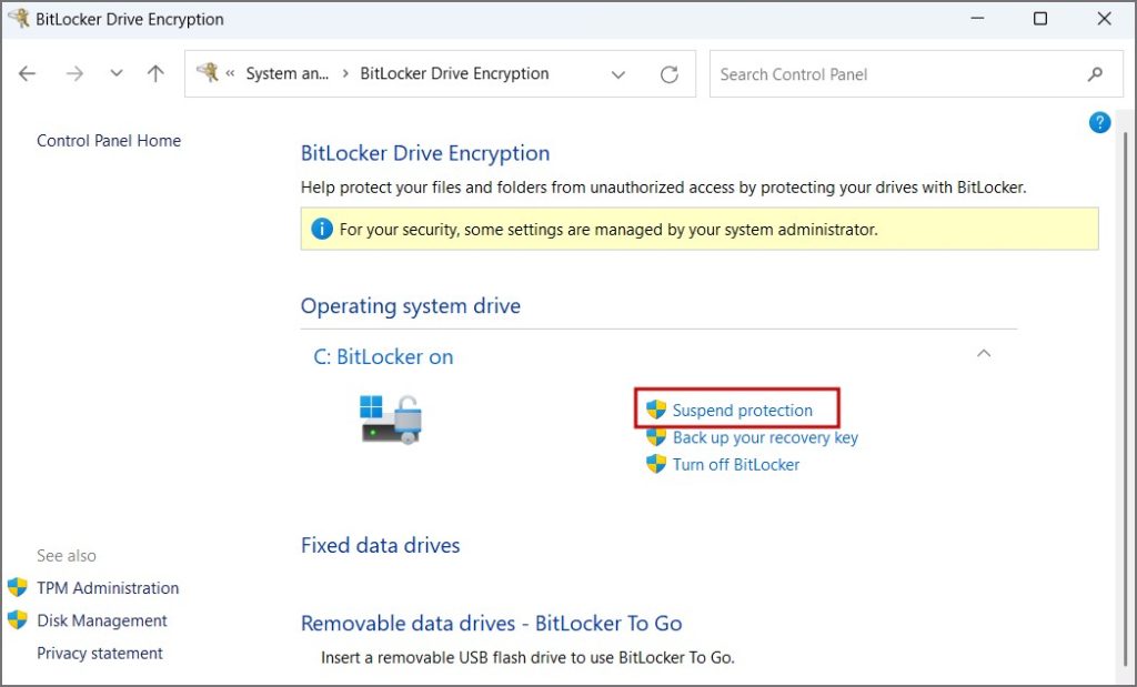 Passaggio 2. Trova l'unità crittografata con BitLocker e seleziona Sospendi protezione.